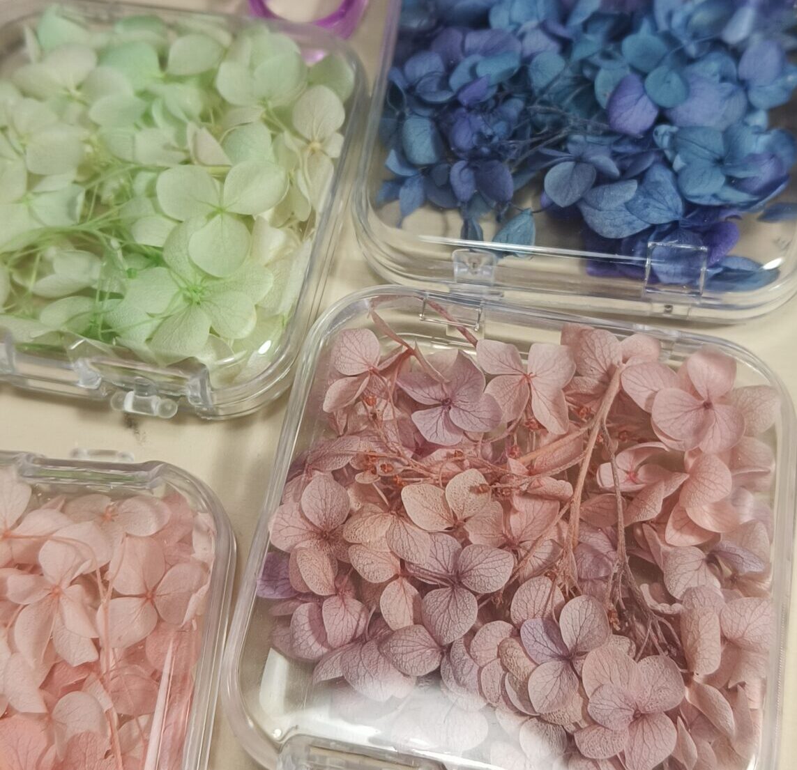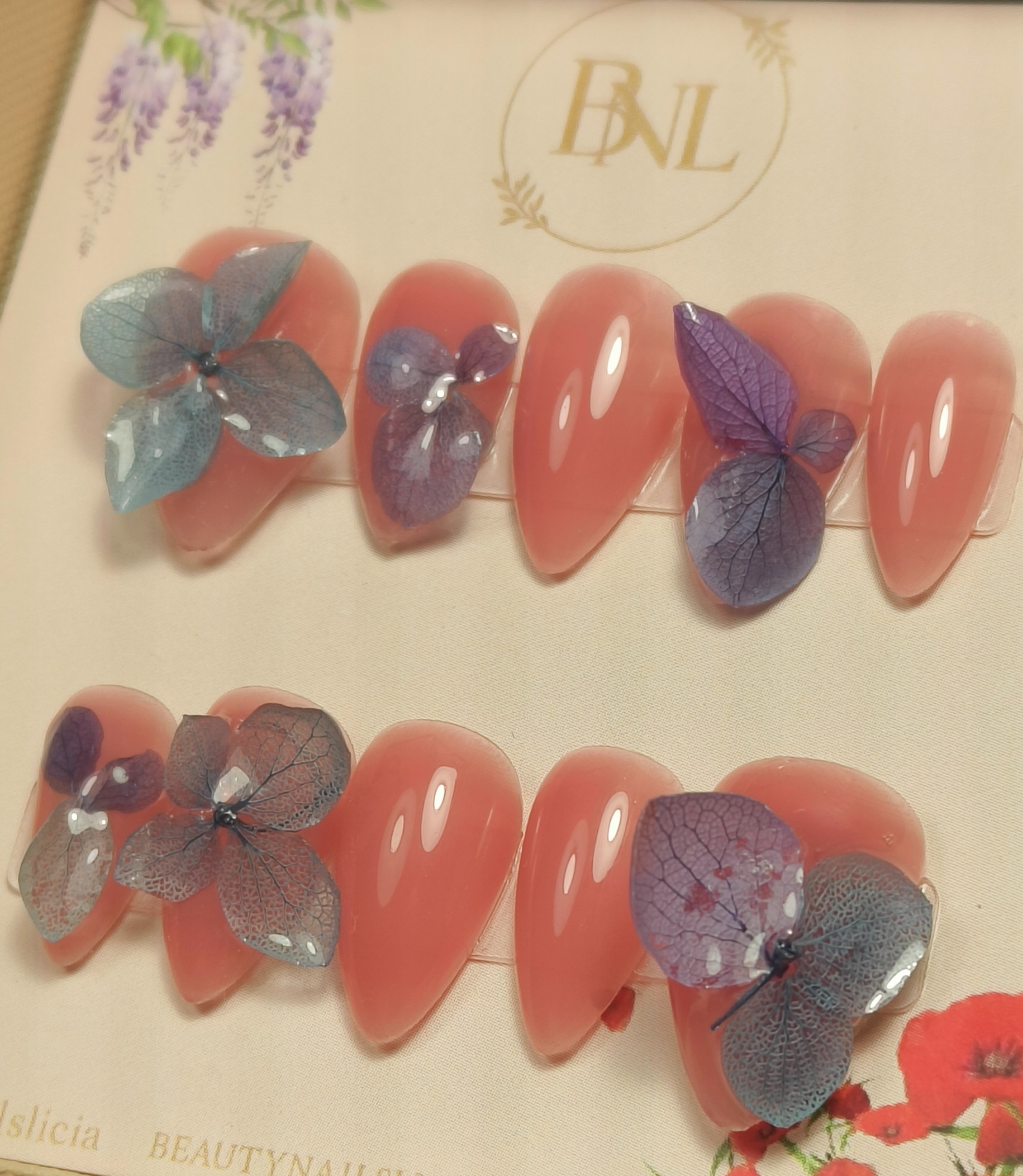 Un set délicat et romantique, imaginé comme un jardin en fleurs. Sur une base nude rosée lumineuse, des fleurs d’hortensia séchées en teintes bleu-gris et violet viennent se poser avec une légèreté poétique.
